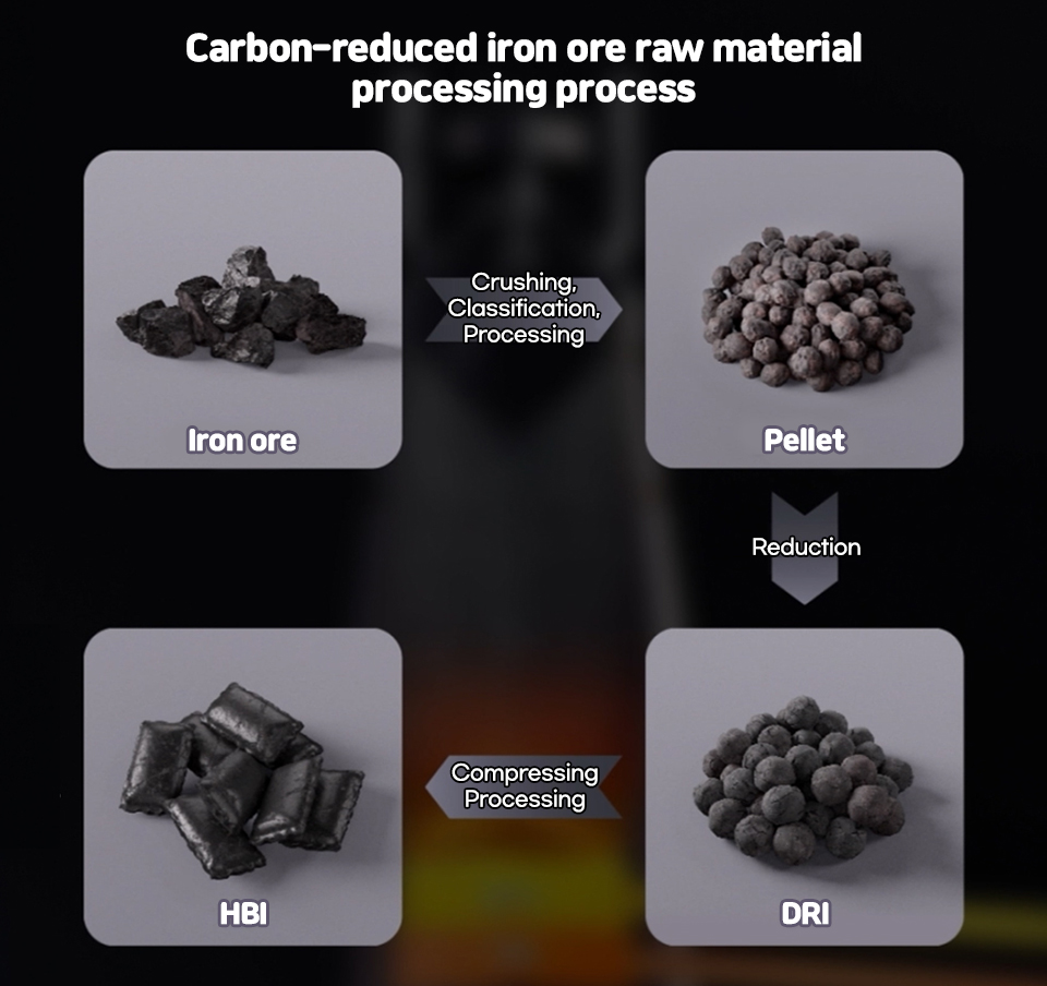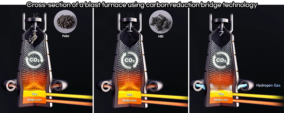 The blast furnace, commonly referred to as a smelting furnace, serves as a core facility in steel production. Coal (coke) and iron ore (sintered ore) are fed into the top of the furnace and layered, while hot air is injected from the bottom, melting the raw materials to produce molten iron. To reduce carbon emissions from blast furnaces, improving the raw materials and reduction processes is essential. POSCO Group is advancing blast furnace-based carbon reduction technologies through three main methods: pellets, Hot Briquetted Iron (HBI), and hydrogen-rich gas.