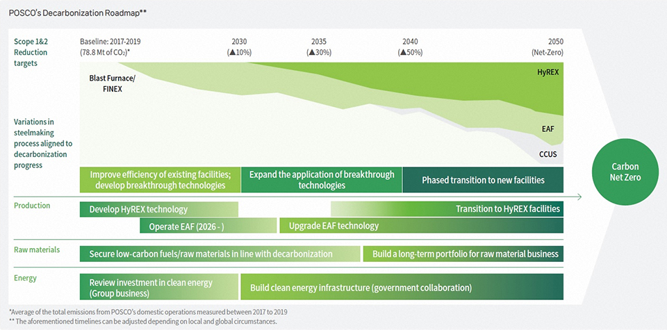 POSCO Group has established its “2050 Decarbonization Roadmap,” which lays out a comprehensive strategy to decarbonize its steel business, the group’s most carbon-intensive sector. The roadmap covers critical areas such as raw materials, investment, energy, and technological innovation. POSCO Group keeps driving its decarbonization journey forward through continuous monitoring and annual updates.