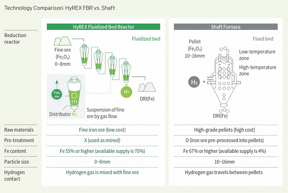 Hydrogen reduction ironmaking is a process that reduces greenhouse gas emissions in the ironmaking process by replacing the reducing agent and coking coal traditionally used to remove oxygen from iron ore with hydrogen. POSCO is developing hydrogen reduction ironmaking based on the fluidized bed reduction furnace technology of its already commercialized FINEX process. Unlike the shaft furnace method commonly used by overseas steelmakers, the fluidized bed reduction furnace has distinct differences in terms of raw material and equipment technology. Shaft furnaces require high-grade DR-grade pellets processed into uniform spherical shapes as raw materials, whereas fluidized bed reduction furnaces can directly utilize ordinary iron ore fines from mines without any additional processing, offering a clear cost and operational advantage.