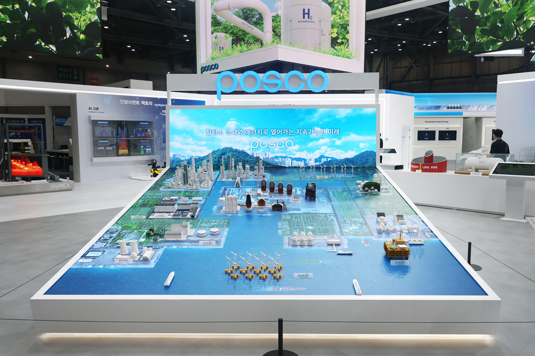 ▲Content embodying POSCO Group’s decarbonization vision is on display at the 2025 Climate Industry International Expo. POSCO Group is pursuing substantial carbon reduction and expanded clean energy transition through AI and bridge technologies, centering on Korea’s Hydrogen Reduction Iron and Steel (HyREX).