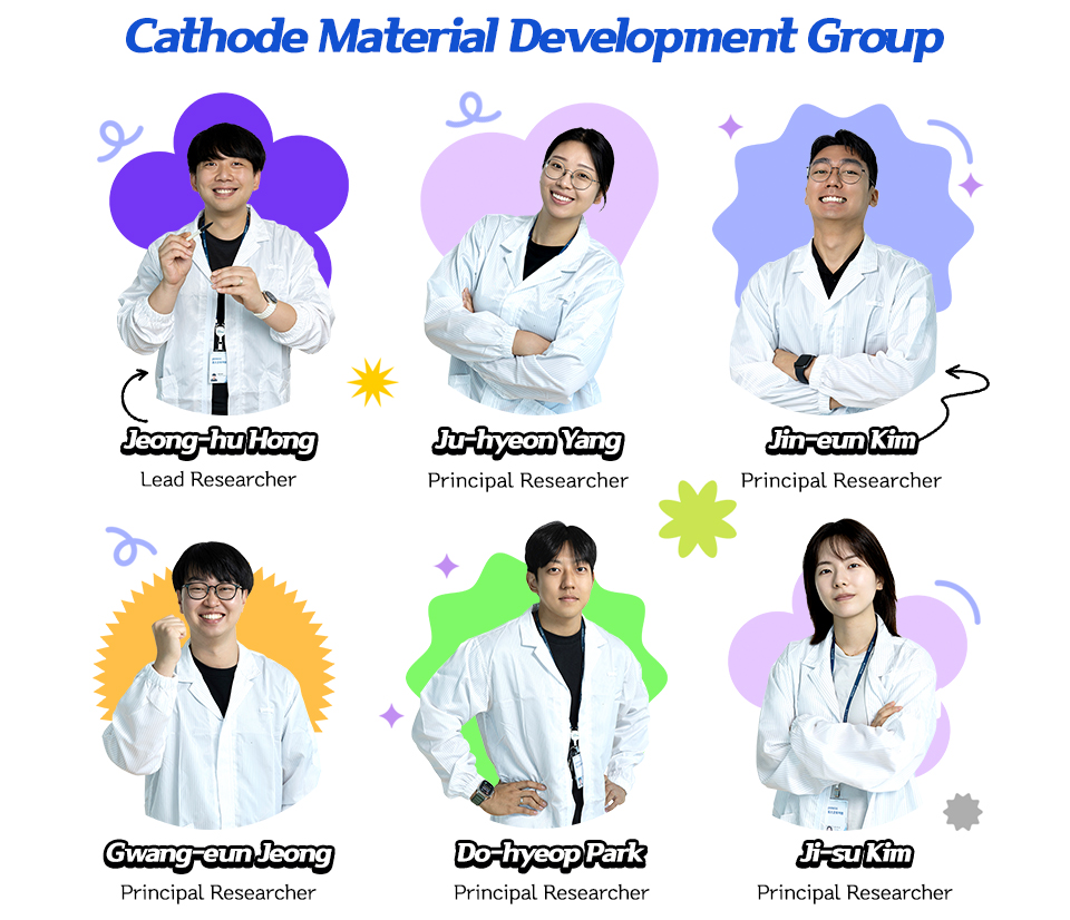 Do-hyeop Park, Principal Researcher Cathode materials can be simply defined as a “source of lithium.” They are produced by combining lithium with precursors made of various metals such as cobalt, manganese, and nickel. The battery’s name, performance, and stability all depend on which metals are used. Batteries such as Lithium Cobalt Oxide (LCO), Nickel Cobalt Manganese (NCM), Lithium Iron Phosphate (LFP), and Lithium Manganese Rich (LMR), among many others using different metal combinations, are currently being developed. Our team, in particular, focuses on the development of LMR cathode materials. Recently, General Motors (GM) and Ford announced plans to launch electric vehicles using LMR batteries in 2028 and 2030, respectively, drawing significant attention to LMR in the global automotive market. Our team is fully committed to advancing LMR batteries, which are poised to become game-changers in the electric vehicle industry.