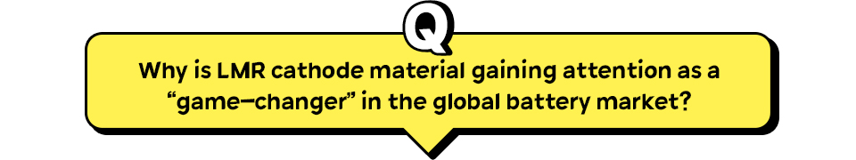 Jeong-hu Hong, Lead Researcher The LMR battery demonstrates outstanding competitiveness not only in terms of cost and performance but also in sustainability. Of course, despite its many advantages, there are challenges that must be addressed before mass production can be realized. To prevent performance degradation, various technological advancements are required, including maintaining stable average voltages and developing surface coating techniques for cathode materials to suppress unnecessary gas generation. In China, a large-scale LFP mass production system is already in place, making a swift transition to LMR production challenging. As a result, innovative research and development are even more crucial. Our team, after an intricate R&D process, has successfully completed the development of LMR cathode materials and is now focusing on establishing techniques for mass production.