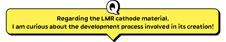 Ju-hyeon Yang, Principal Researcher As Do-hyeop Park mentioned, cathode production involves a calcination process, where various metal precursors such as nickel, cobalt, manganese, and aluminum are combined with lithium sources at high temperatures. During this process, we selected a variety of precursor candidates, evaluated their key physical properties, and identified the most promising materials for experimental application. By applying accumulated technical knowledge and analyzing the effects of variables throughout the development process, we successfully optimized LMR cathode materials, evaluating their initial battery capacities and lifespans. Through continuous refinement of material design, process conditions, and experimental testing, we were also able to assess the feasibility of mass production.