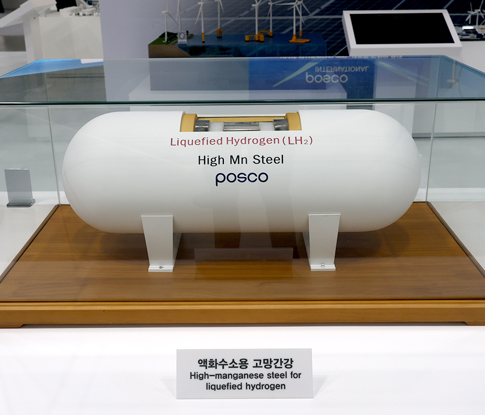 ▲ 2025 기후산업국제박람회 포스코그룹 부스에 전시된 고망간강 액화수소용 저장탱크 모형.