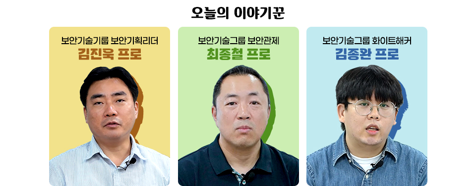 안녕하세요. 보안기술그룹 화이트해커 김종완 프로입니다. 화이트 해킹팀은 모의해킹 업무를 주로 합니다. 웹, 인프라, 모바일 앱 대상으로 공격자의 관점으로 취약점을 진단하고 조치합니다.