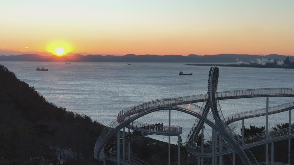 ▲새해 붉게 떠오르는 해를 바라보며 장인화 회장을 비롯한 포스코그룹 임직원들이 포항 스페이스워크 위에서 안전 기원 및 비전 실현을 위한 결의를 다지고 있다.