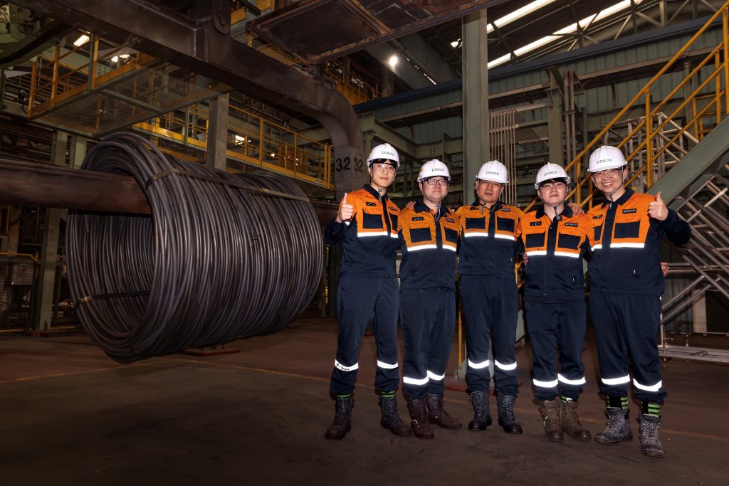 ▲23mm급 대형 ‘현가용 스프링강’ 양산 기술을 공동 개발한 임직원들이 4선재 공장에서 기념사진을 촬영했다.