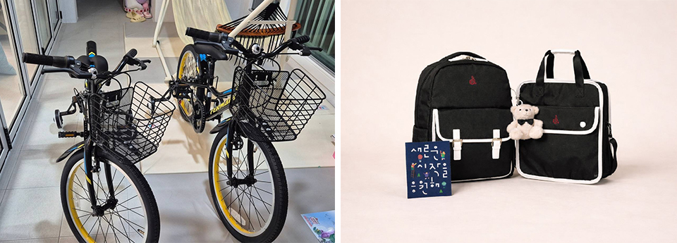 ▲ 포스코에서 입학 선물로 전달한 자전거와 책가방.