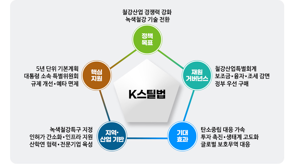 K-스틸법은 국내 철강업계가 직면한 글로벌 수요 둔화, 저가 철강재 수입 증가, 미국 등 주요국의 관세 장벽 강화, 그리고 탈탄소 규제 부담 심화에 대응하기 위한 종합 입법 패키지입니다. 법안에는 철강산업의 경쟁력 강화와 탈탄소 전환을 지원하기 위해 ▲저탄소 인증제 도입 ▲저탄소 철강 특구 신설 ▲기업결합 사전 심사 기간 단축 ▲공정거래법상 공동행위 예외 및 정보 공유 허용 등 다양한 특례 조항이 포함됐습니다.