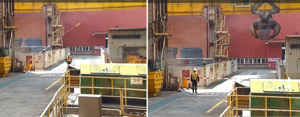 ▲Smart Fool Proof 시스템 적용 현장. 왼쪽은 차단기 개방 상태, 오른쪽은 크레인 이동 감지 시 AI가 신호를 보내 차단기가 작동된 상태.