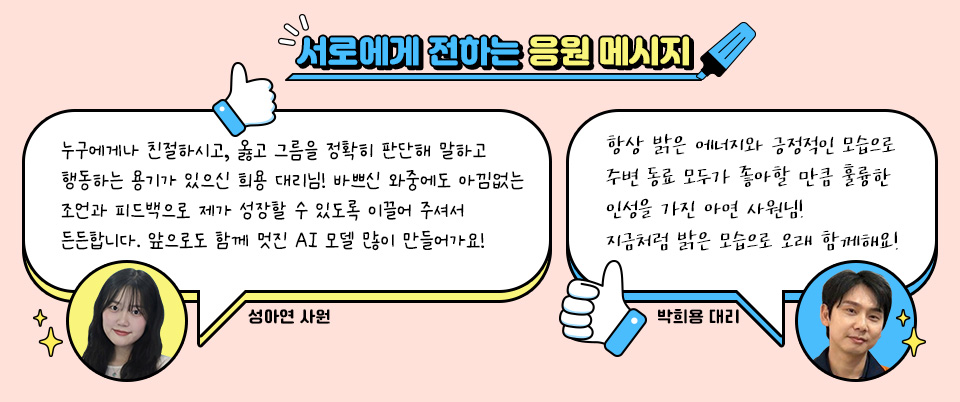 박희용 대리AI 모델은 작은 변수 하나에도 성능이 크게 달라지기 때문에, 끝까지 원인을 파고드는 끈기가 필요해요. 또 AI는 계속 발전하기 때문에 현재에 안주하지 않고 끊임없이 배우는 자세도 중요합니다.