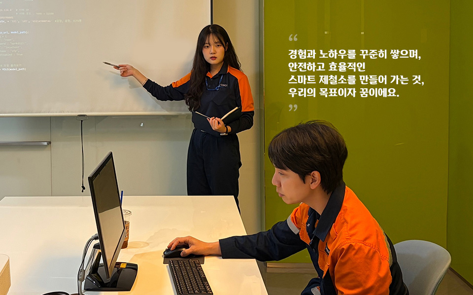 성아연 사원단기적으로는 현재 개발 중인 모델들의 성능을 최대한 끌어올리고, 더 빠르게 자동으로 현장에 확산 적용될 수 있도록 기술을 개발하는 게 목표입니다. 장기적인 목표는 제철소의 반복적이고 위험한 업무를 모두 자동화해 안전하고 효율적인 스마트 제철소를 만드는 데 기여하는 거고요. 또, AI 기술에 관심 있는 동료들에게 길잡이 역할도 하고 싶습니다. 제가 쌓은 경험과 노하우를 공유해, 더 많은 동료들이 AI 기술을 이해하고 활용하도록 돕는 것이 제가 그리는 꿈입니다.