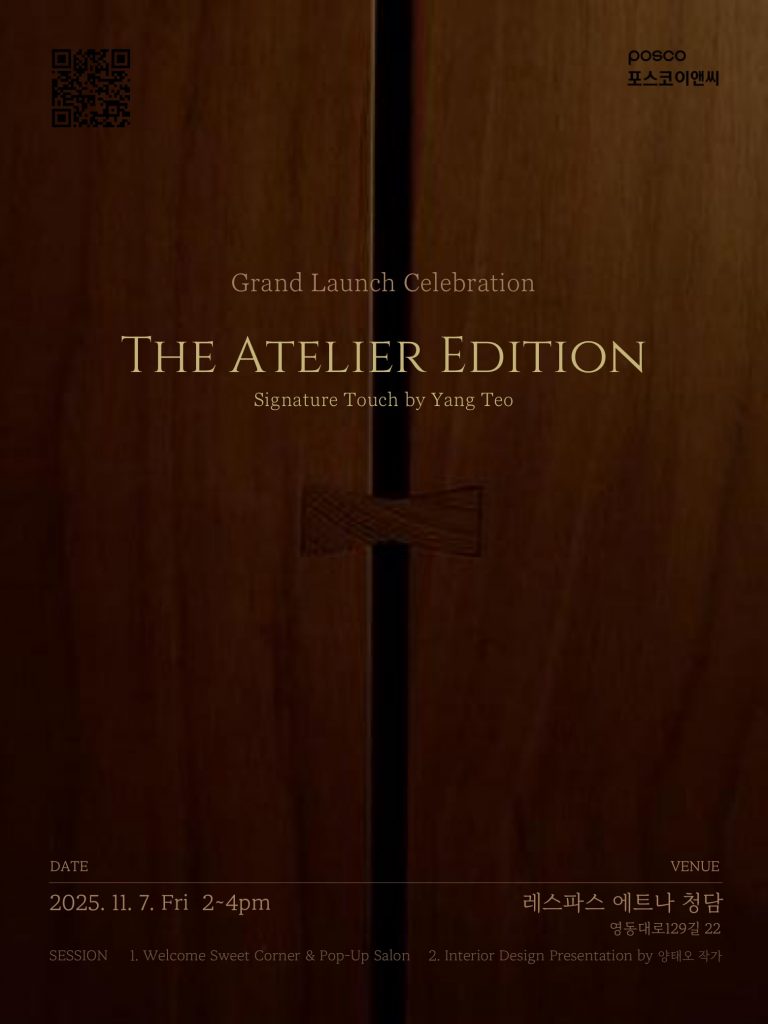 포스코이앤씨(사장 송치영)는 세계적인 인테리어 디자이너 양태오 작가와 함께 개발한 하이엔드 인테리어 상품 ‘아틀리에 에디션(The Atelier Edition)’을 오는 11월 7일 서울 레스파스 에트나 청담에서 런칭 행사를 열고 공식 공개한다.