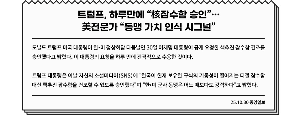 2025 APEC(아시아태평양경제협력체)를 계기로 10월 29일 경주에서 ‘2차 한미 정상회담’이 열렸습니다. 그 다음날인 10월 30일, 미국으로부터 깜짝 소식이 전해졌습니다. 도널드 트럼프 미국 대통령이 이재명 대통령의 핵추진 잠수함 건조 요청을 하루 만에 전격 승인한 것입니다. 이 결정으로 우리나라 군사 안보 분야의 30년 숙원사업이었던 핵추진 잠수함(SSN) 도입이 가시화됐습니다. 핵추진 잠수함은 원자로에서 발생하는 열로 증기를 만들어 터빈을 구동하여 추진하는 잠수함으로, 장거리·장시간 작전과 은밀성이 필요한 해군 전략에서 중요한 역할을 하는 첨단 군사 장비입니다. 이번 승인 발표는 우리나라 군사 안보 역량 강화는 물론, 글로벌 방산·해양 산업에서의 위상 변화를 예고하고 있습니다.