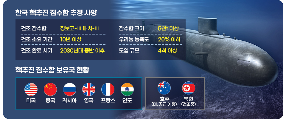 한편, 국제 비확산 체제와의 조율도 큰 과제로 남아 있는데요. 핵무기를 탑재하지 않는 핵 ‘추진’ 잠수함은 핵확산금지조약(Non-Proliferation Treaty, NPT) 위반은 아니지만, 농축 우라늄의 군사적 목적 사용 첫 사례가 될 수 있는 만큼 국제원자력기구(IAEA)의 사찰 문제와 핵공급국그룹(Nuclear Suppliers Group, NSG)의 동의가 필요합니다.
