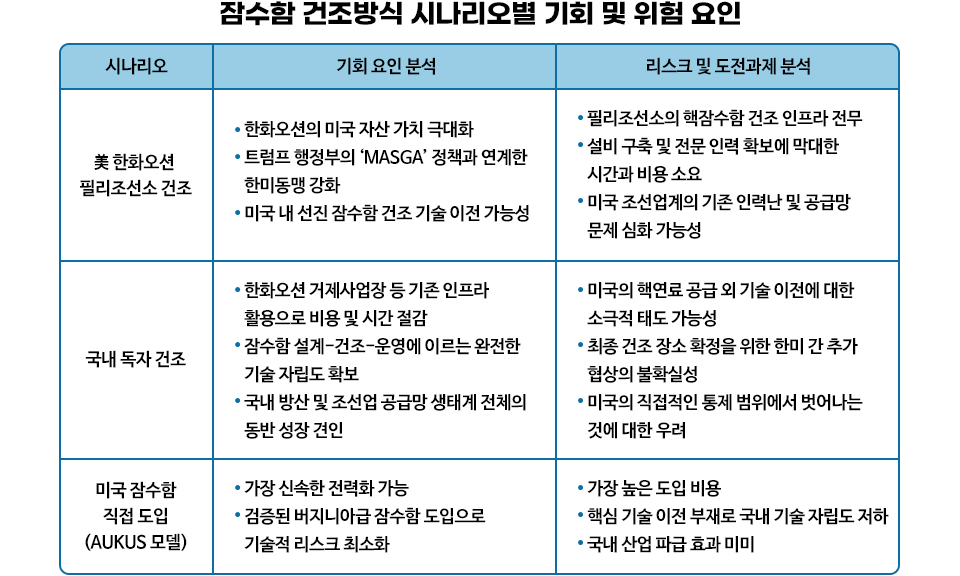 먼저, ‘미국 필리조선소 건조’는 한미 양국의 정치경제적 이해관계에 부합하는 현실적인 대안이지만, 막대한 초기 투자 리스크가 있습니다. 또한 ‘국내 독자 건조’는 기술 자립과 산업 생태계 동반 성장 측면에서 최상의 시나리오지만 미국의 최종 동의를 획득해야 하는 높은 허들이 남아 있죠. 반면, 미국 잠수함 직접 도입을 포함한 오커스(AUKUS)* 모델은 가장 신속한 전력화가 가능하나 국내 산업으로의 파급 효과는 미미합니다.