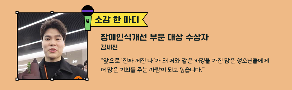 어렸을 적부터 의족을 착용하고 생활했습니다. 자라면서 ‘불가능하다’, ‘못할 것이다’라는 이야기를 많이 들어왔지만, 저는 이렇게 세상 밖으로 나올 수 있었습니다. 제가 의족을 착용한 채 처음 세상 밖으로 나설 수 있었던 건 ‘기적’이었고, 의족을 벗은 모습을 보여줄 수 있었던 것은 저에게 ‘기회’였습니다. 앞으로 ‘진짜 세진 나’가 되어 저와 같은 배경을 가진 많은 청소년들에게 더 많은 기회를 줄 수 있는 사람이 되고 싶습니다.